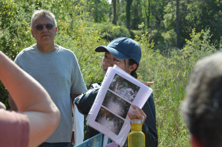 Découverte du marais des bourbes de l’Allerie pour une cinquantaine de participants à la fête de la nature organisée par l’APNO (l’Association pour la protection de la nature au pays des Olonnes), Josiane, prend l’animation d’un groupe avec Camille* et Nicole l’autre avec André, Patrick et Julie Holtoff du Conservatoire du littoral.