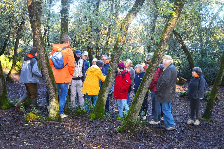 Le bois Saint Jean est une relique de la grande forêt médiévale qui s’étendait alors sur le littoral des Sables à Jard sur mer. En 1977, l’APNO s’est mobilisé afin d’éviter la poursuite de l’urbanisation avec un projet de Thalassothérapie et c’est le Conservatoire du Littoral qui venait d’être crée, qui a racheté 25ha pour conserver ce bois très original. Il bénéficie d’une insolation de plus de 2200 heures et présente un superbe boisement de chênes verts (Quercus ilex) et les espèces végétales thermophiles qui lui sont associées. En bord de mer certains boisements sont des taillis côtiers denses avec anémomorphose (leur forme est modifiée par le vent chargé d’embruns salés). Des plantations de pin maritime ( Pinus pinaster) ont été réalisés à partir de 1836 pour la fixation du sables, nous avons observé 3 espèces de bruyère la bruyère cendrée(Erica cinerea ) , la bruyère à balai (Erica scoparia )et la callune(Calluna vulgaris) ; des fougères Polypode et Fougère aigle, de nombreux lichens, des champignons en nombre après les fortes pluies de l’automne. Pratiquement toutes les plantes vivent en symbiose avec les champignons, le champignon développe son mycelium, des filaments blancs autour des racines des plantes et interagit avec les plantes en leur offrant un meilleur accès à l’eau et aux sels minéraux contenus dans le sol et une protection contre les agents pathogènes. En échange il reçoit les matières carbonées qu’il utilise pour se nourrir.