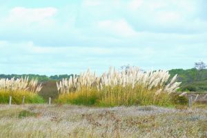 L’herbe de la pampa Cortaderia selloana vient d’ Argentine, cette herbacée vivace de 2 à 4m de haut formant des touffes de plusieurs pieds, a des feuilles retombantes à bords coupants .Ses inflorescences forment des plumets blanchâtres ou rosés de 50 à 100 cm de long portant des fleurs mâles et femelles recherchés pour les bouquets secs ! Le caractère envahissant de la plante est lié à une grande production de graines sur les pieds femelles (plus de 10 millions par pied) entrainé par le vent jusqu’à 25 km elle est présente le long des routes, des voies ferrées. Dans les friches et lisières forestières, cette plante augmente les risques d’incendie car son feuillage est très inflammable. Cette plante a un impact sur la flore et sur la faune locale, ses plumeaux sont allergènes pour l’Homme.