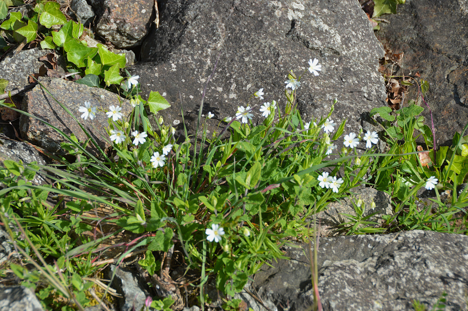 Sur le barrage, construit en argile compactée de provenance locale, nous avons observé au travers des enrochements l’Ornithope délicat Ornithopus perpusillus, Tabouret des champs Thlaspi arvense, Erodium à feuilles de cigue Erodium cicutarium , petite oseille Rumex acetosella, mâche en fleur Valerianella locusta, millepertuis perfolié Hypericum perforatum, une véronique, une orchidée :l’Orchis morio … et à nouveau lecompagnon rouge. Si la météo avait été plus clémente, nous aurions peut-être pu observer le lézard des murailles, le lézard vert et autres reptiles présents sur ce type de milieu.