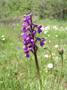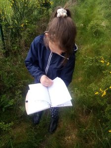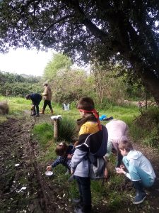 Nous continuons en empruntant un chemin creux bordé de superbes chênes, quelques traces y sont visibles dans la boue et un peu plus loin, le groupe s’arrête, de belles empreintes de chevreuils et de sangliers sont là, nous sortons alors le plâtre rapide et très vite les enfants s’activent pour faire un prélèvement de celles-ci … sourires ! En attendant que le plâtre sèche, le groupe continue, le lin cultivé est bien en fleur, les orchidées aussi Anacamptis morio comme la Jacinthe des bois Hyacinthoides non-scripta et nous découvrons la saveur de noix de coco des fleurs de l’Ajoncs d’Europe Ulex europeus … hum, trop bon !