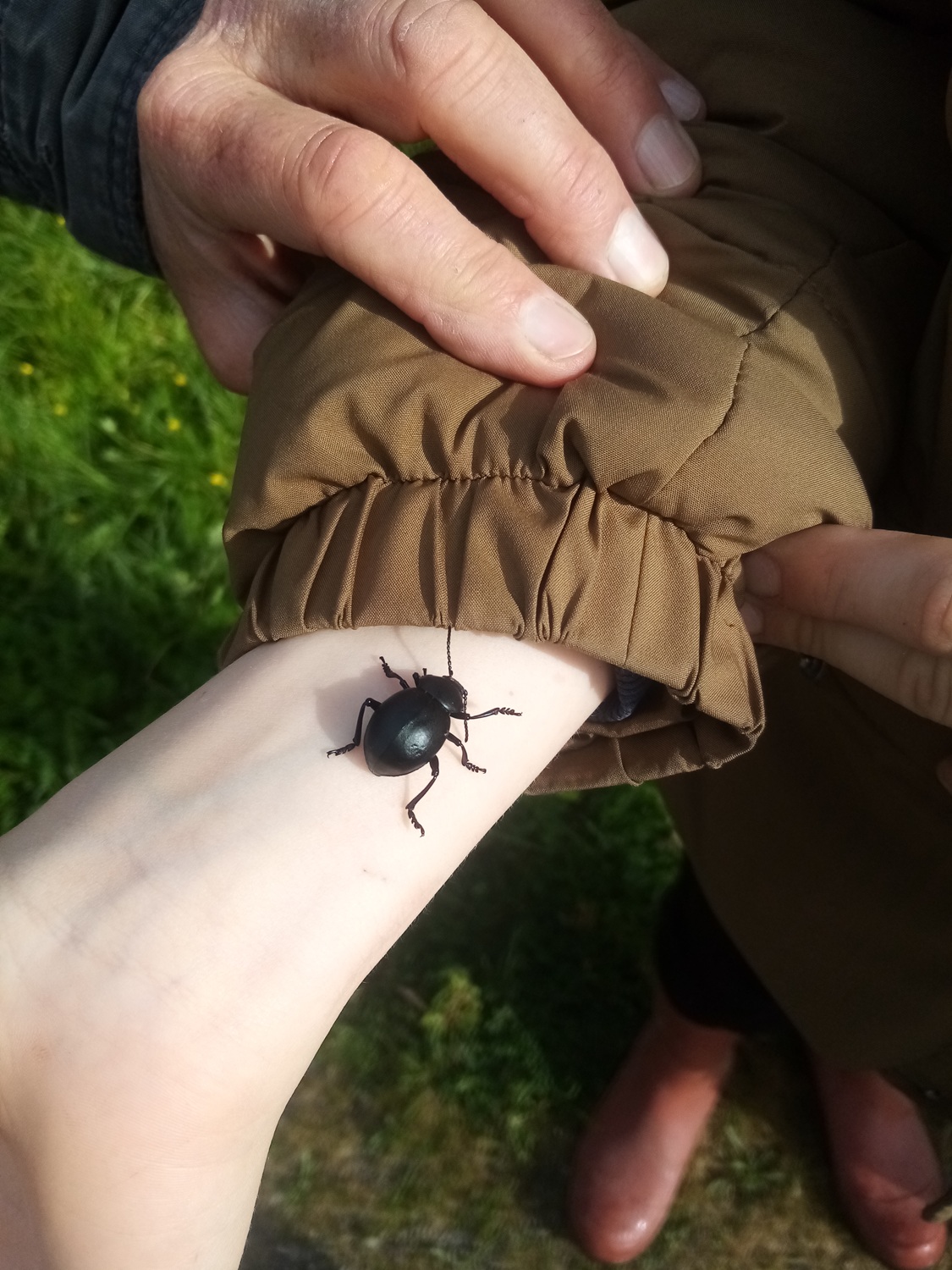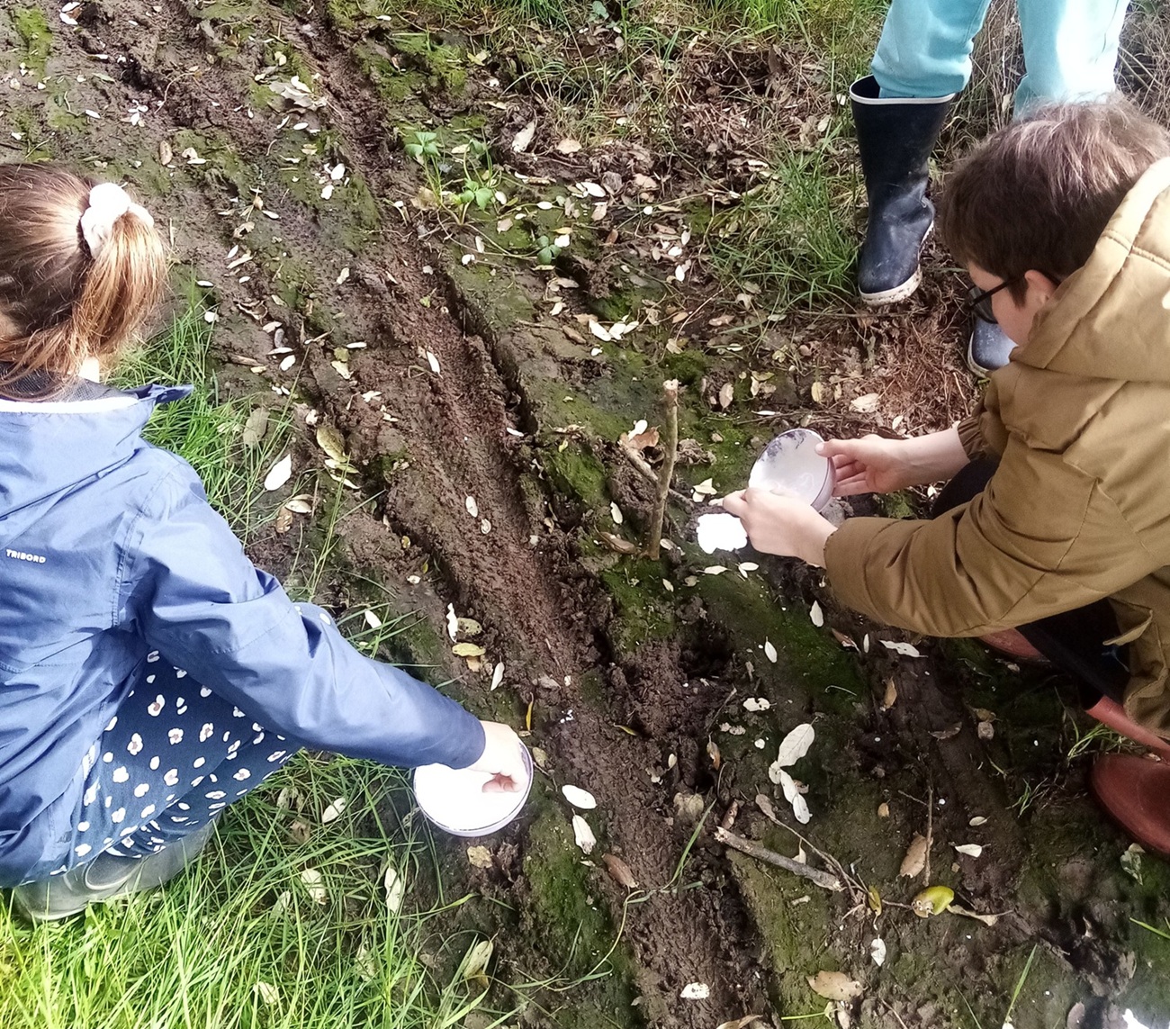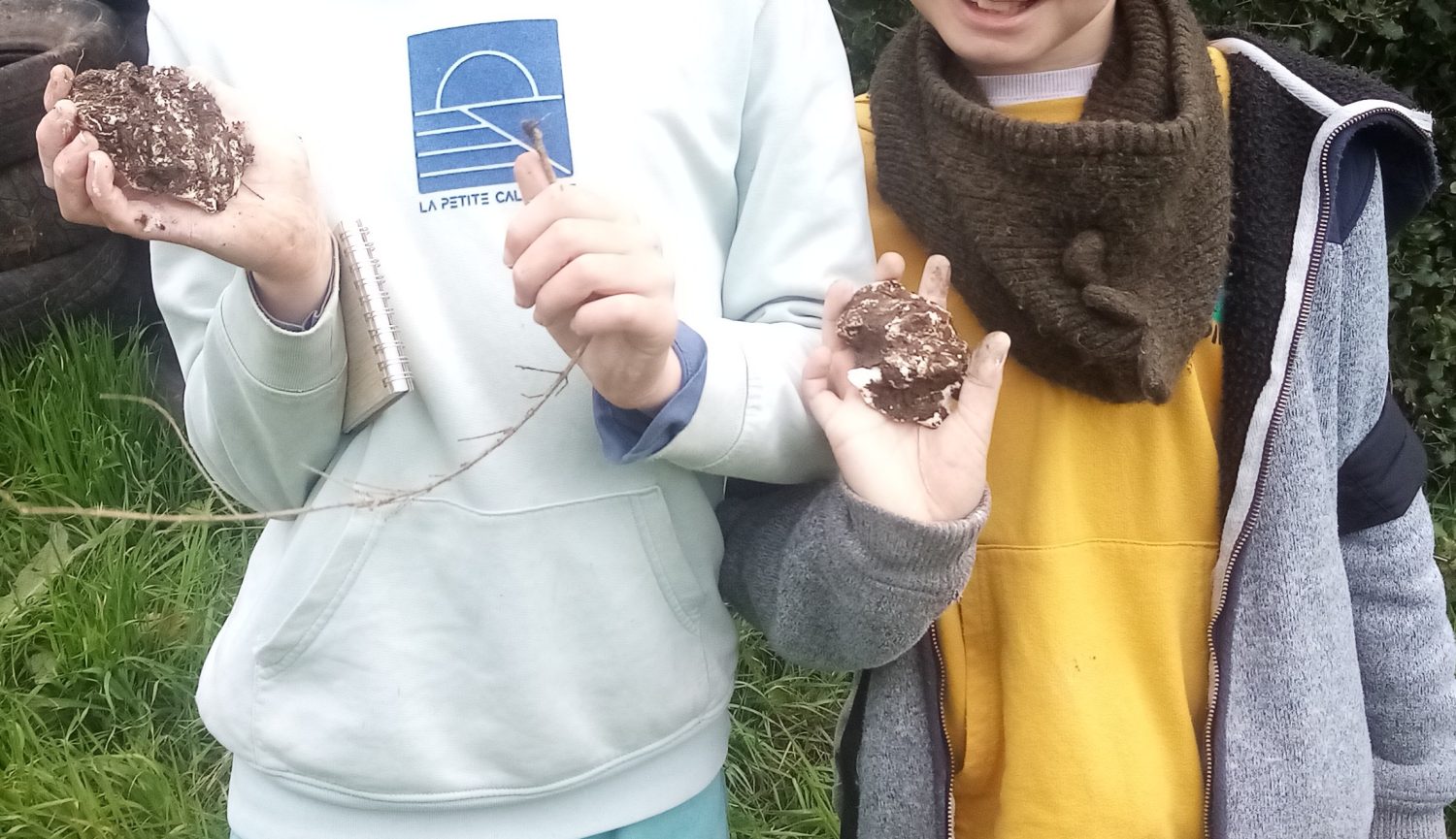 Nous continuons en empruntant un chemin creux bordé de superbes chênes, quelques traces y sont visibles dans la boue et un peu plus loin, le groupe s’arrête, de belles empreintes de chevreuils et de sangliers sont là, nous sortons alors le plâtre rapide et très vite les enfants s’activent pour faire un prélèvement de celles-ci … sourires ! En attendant que le plâtre sèche, le groupe continue, le lin cultivé est bien en fleur, les orchidées aussi Anacamptis morio comme la Jacinthe des bois Hyacinthoides non-scripta et nous découvrons la saveur de noix de coco des fleurs de l’Ajoncs d’Europe Ulex europeus … hum, trop bon !